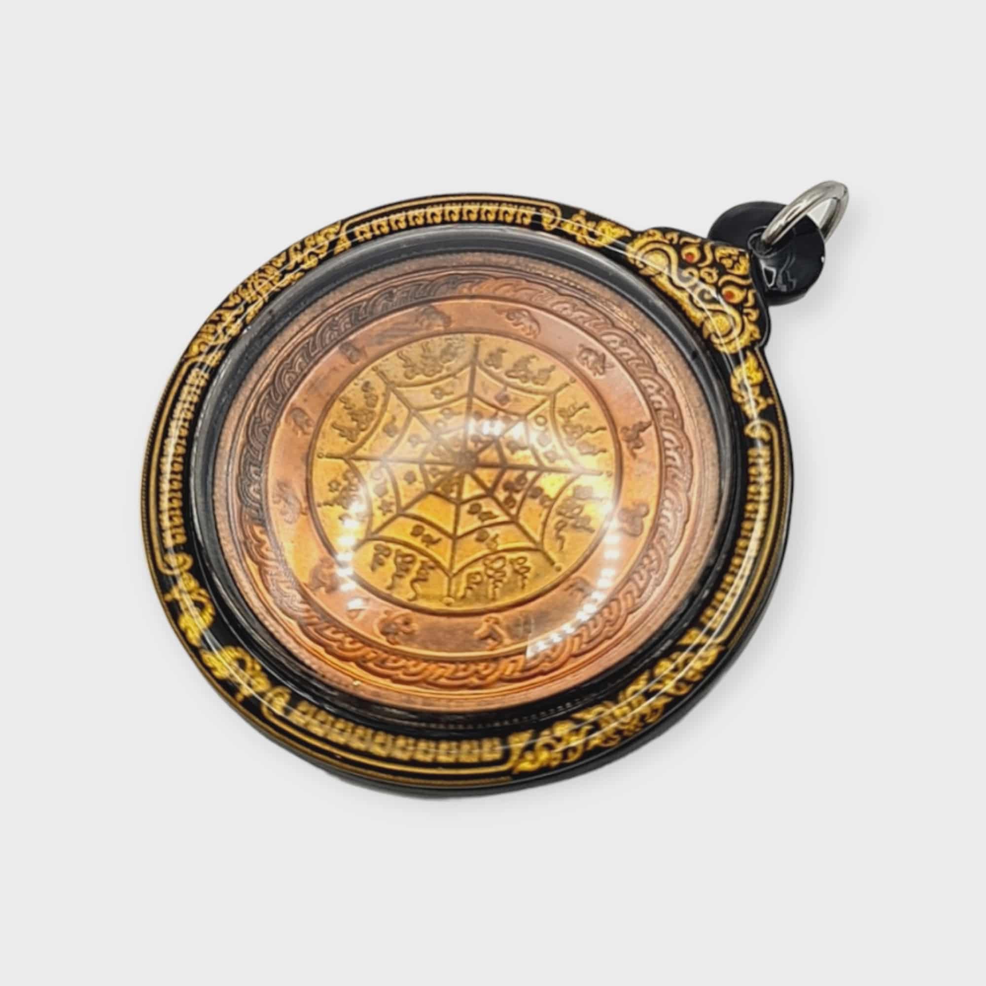 The front features Phra Jatukam Ramathep in majestic form surrounded by celestial symbols, while the back displays the sacred “Web of Destiny” yantra, representing protection, prosperity, and victory over obstacles.
