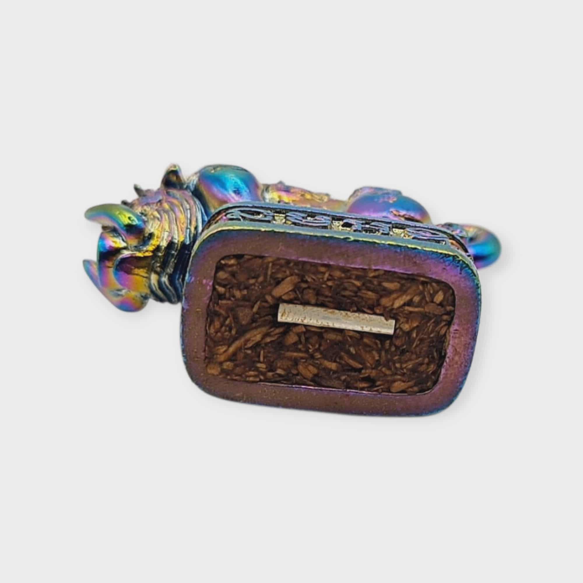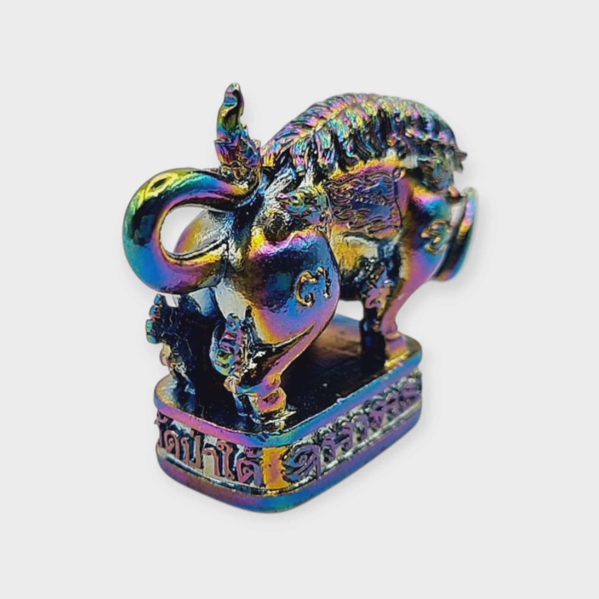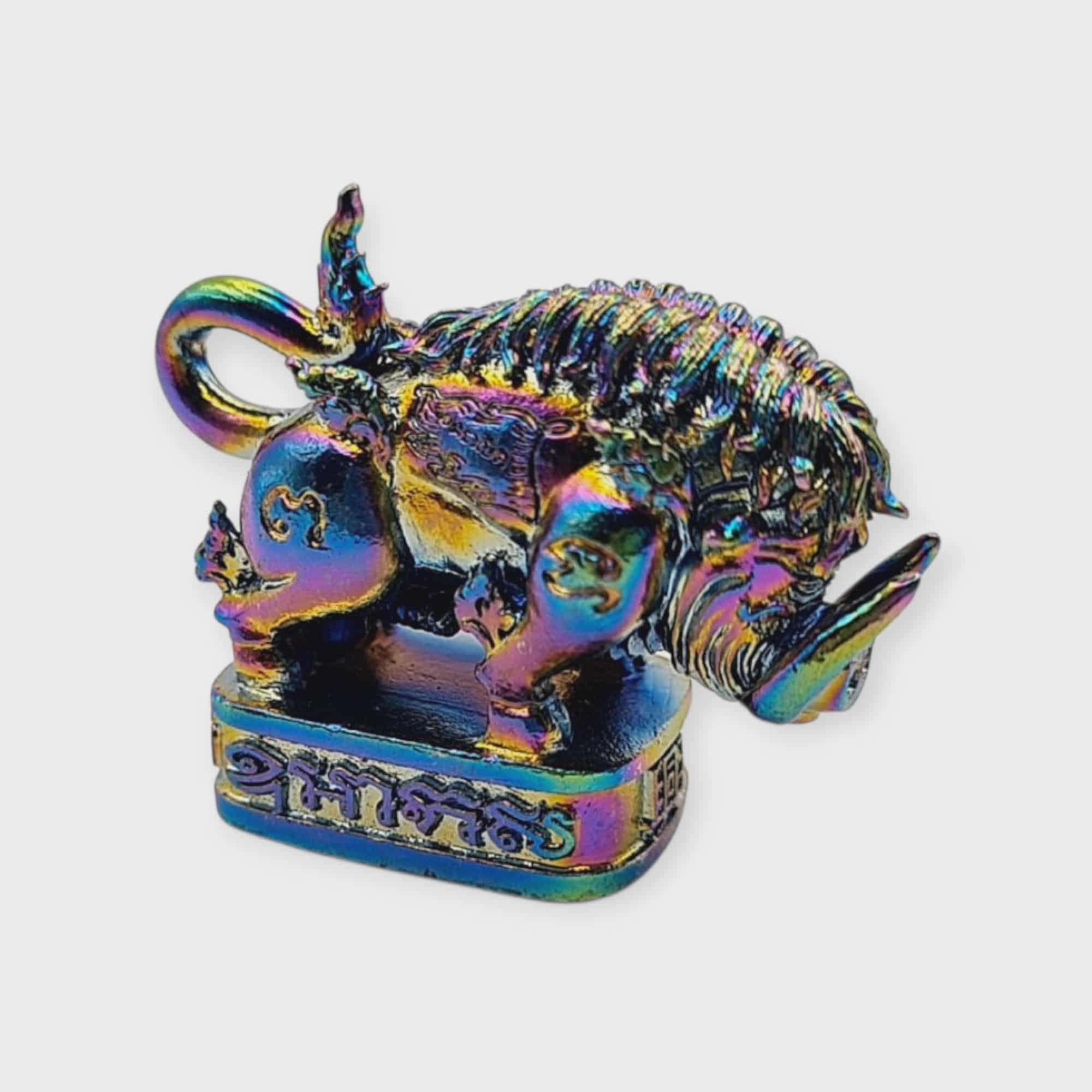 Crafted in blue rhodium with a shimmering rainbow finish, this piece contains a silver takrut scroll imbued with sacred incantations for wealth and protection. Each amulet comes sealed in a waterproof acrylic case, perfect for daily wear or collection.