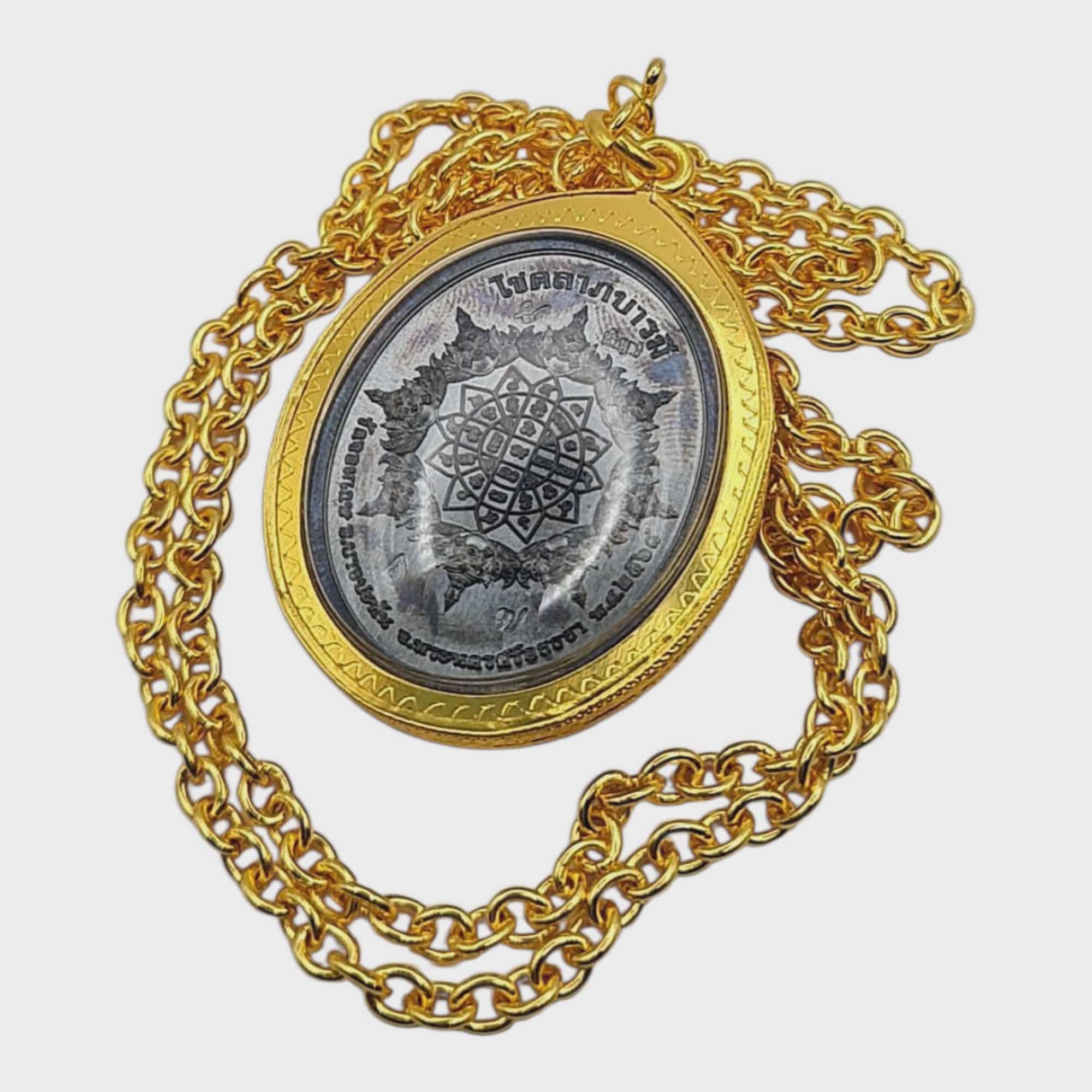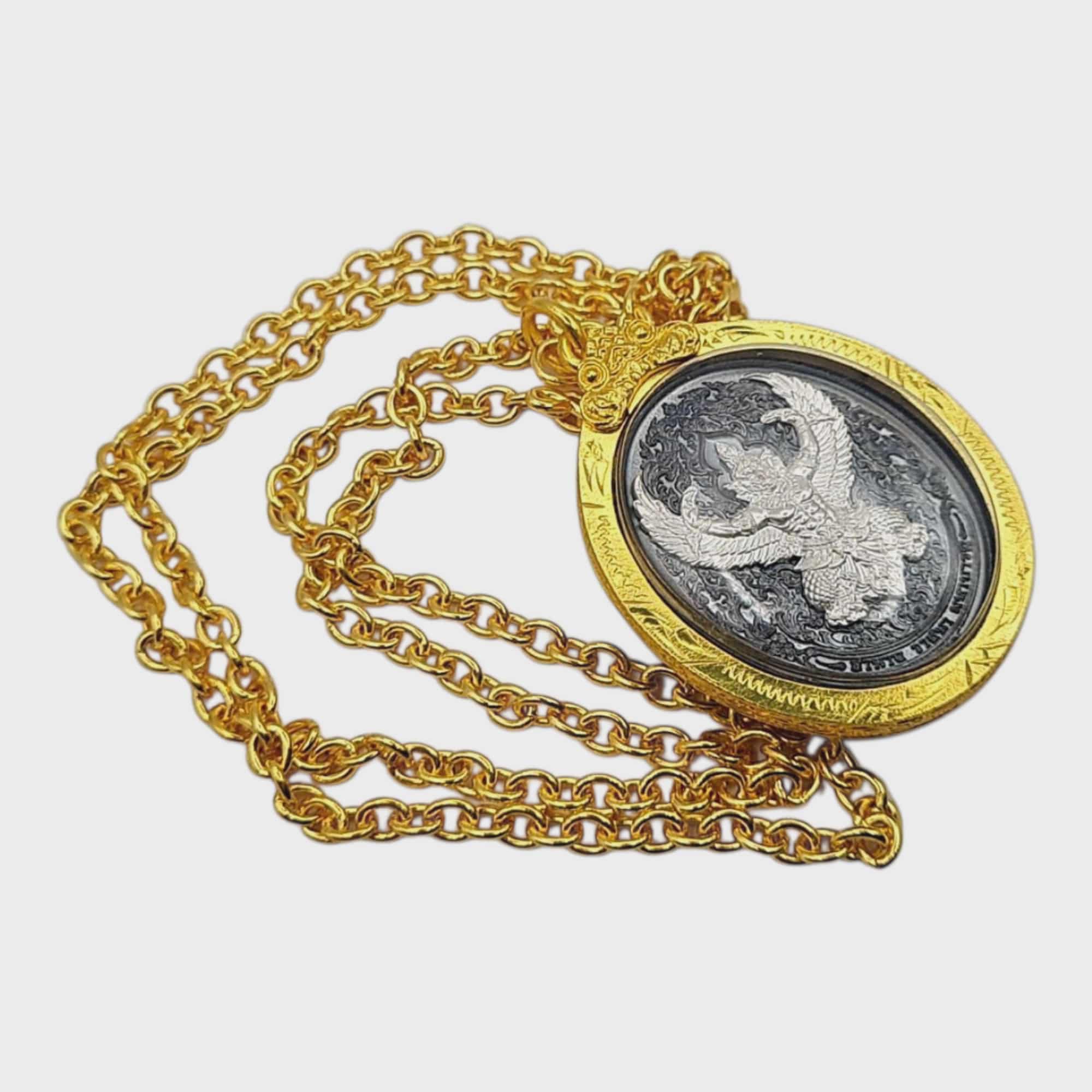 The front features the majestic Phaya Krut (Garuda), symbol of royal power, invincibility, and unstoppable success. Garuda is revered as the King of Birds and the mount of Lord Vishnu, representing victory, dominance over obstacles, and supreme protection.