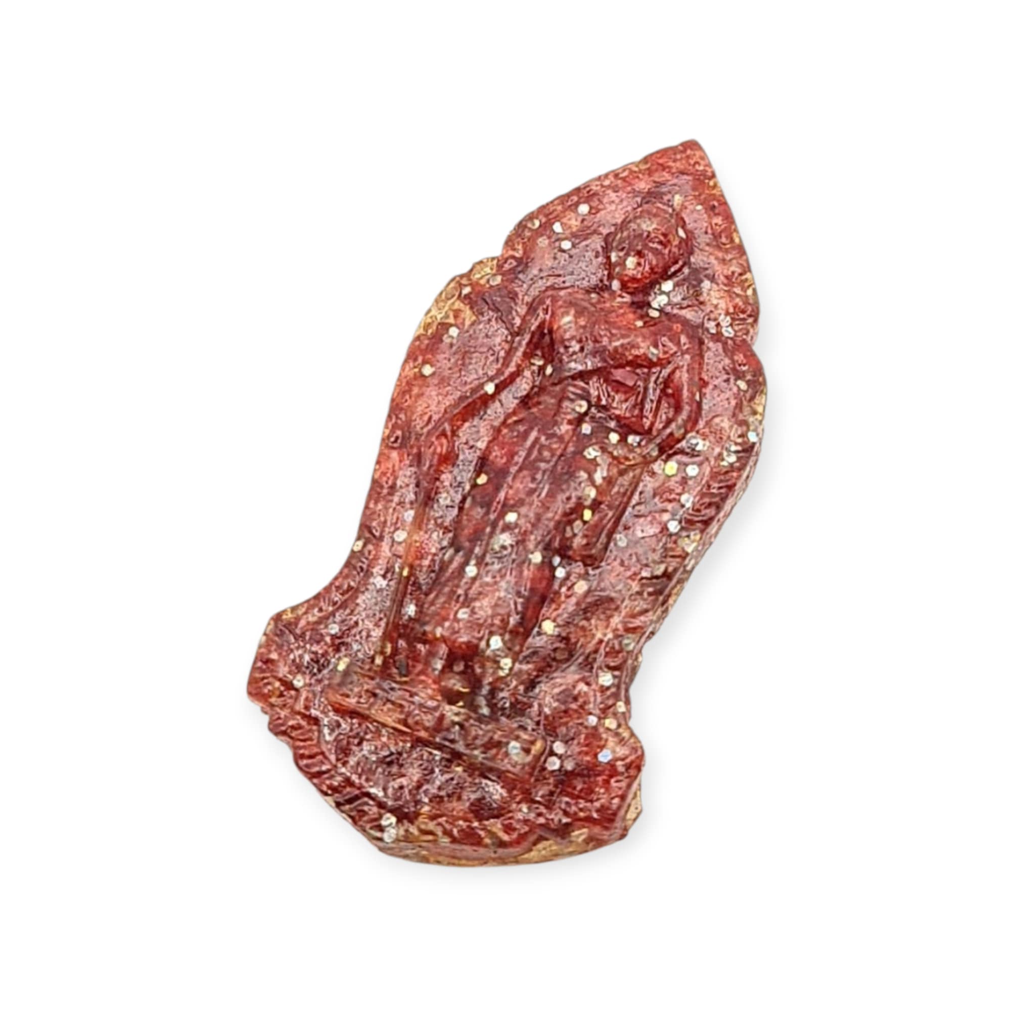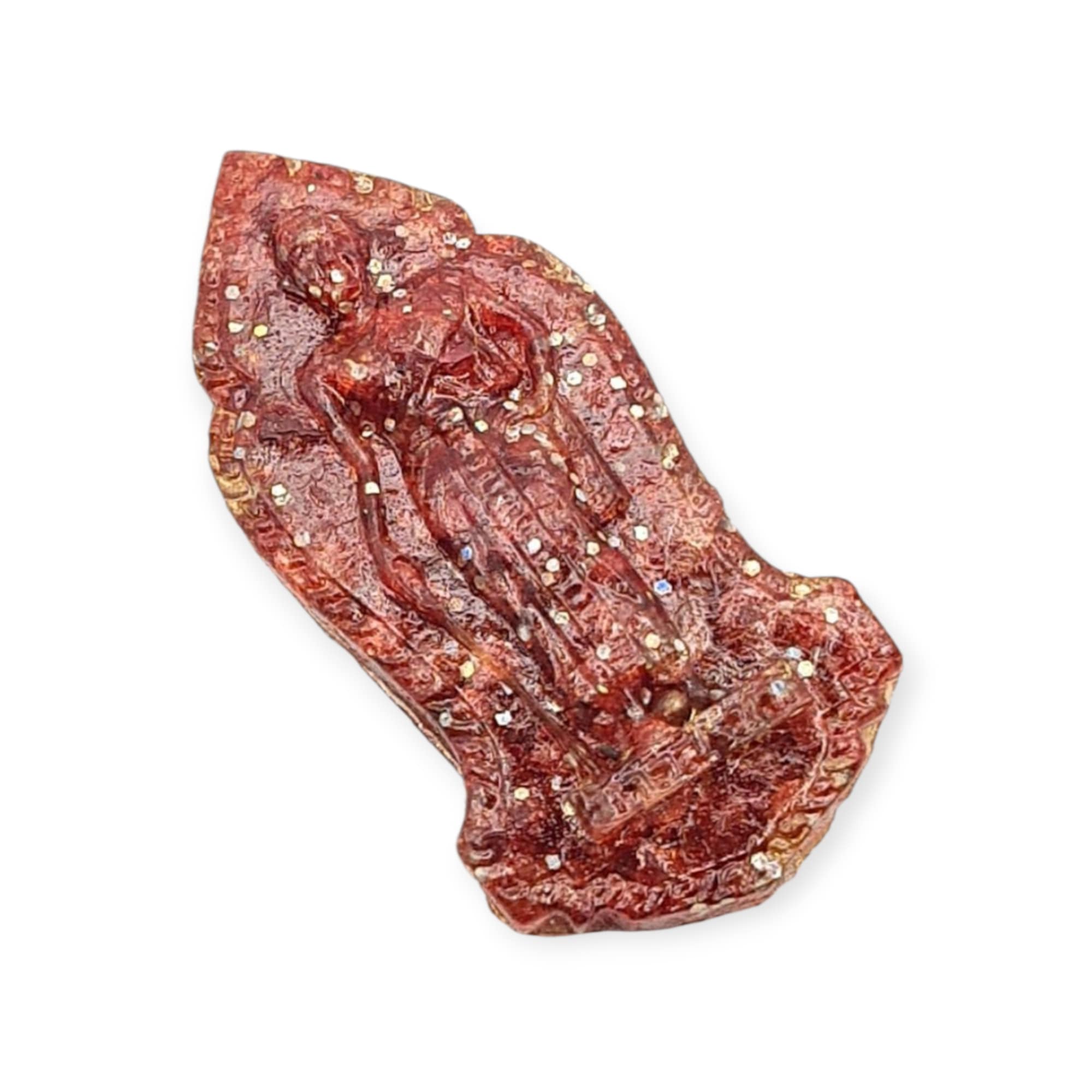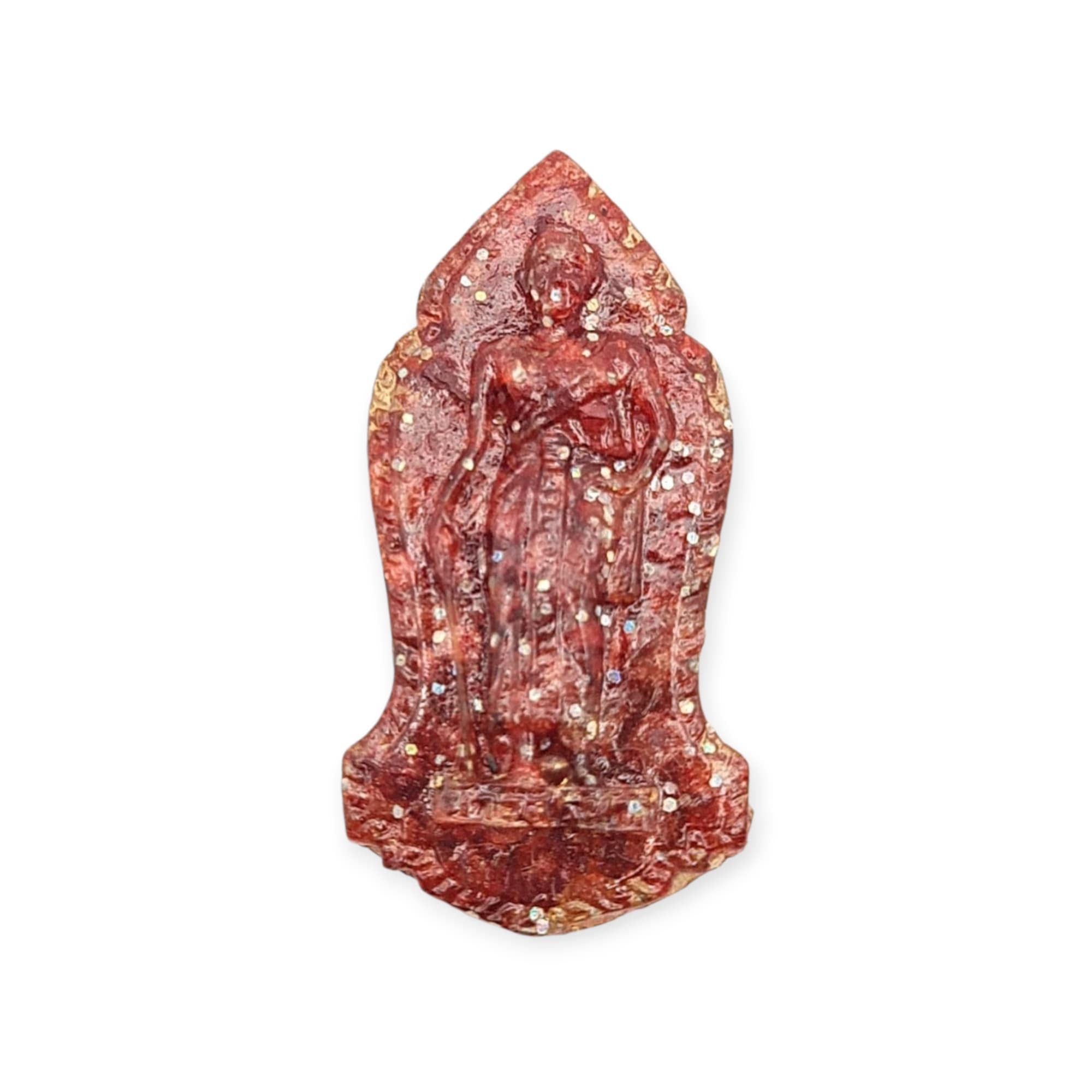 This sacred Thai amulet depicts Ya Mo amulet (Thao Suranari), the revered heroine of Korat, crafted from ruby powder mixed with sacred materials and consecrated by Luang Phor Koon Parisutho of Wat Ban Rai. The amulet is decorated with glittering sacred powders, symbolizing victory, courage, and charm.