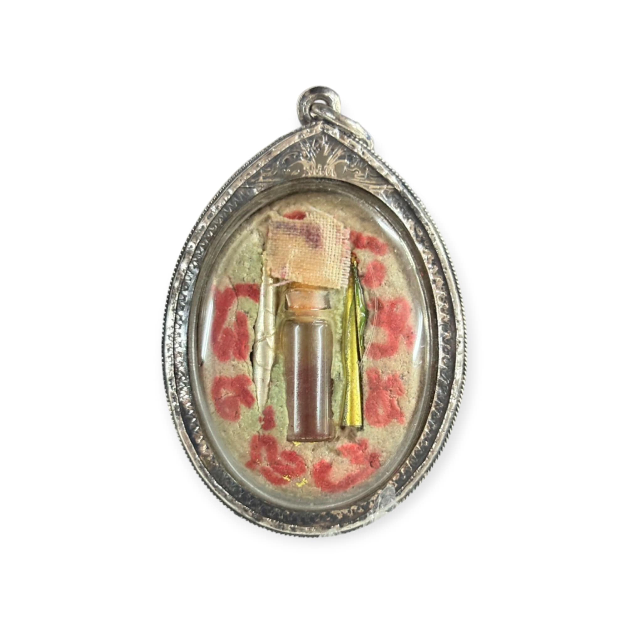 The locket is specially empowered with prai powders, takrut chin arthan, and Pha Hor Sop, all enclosed in a silver waterproof case.