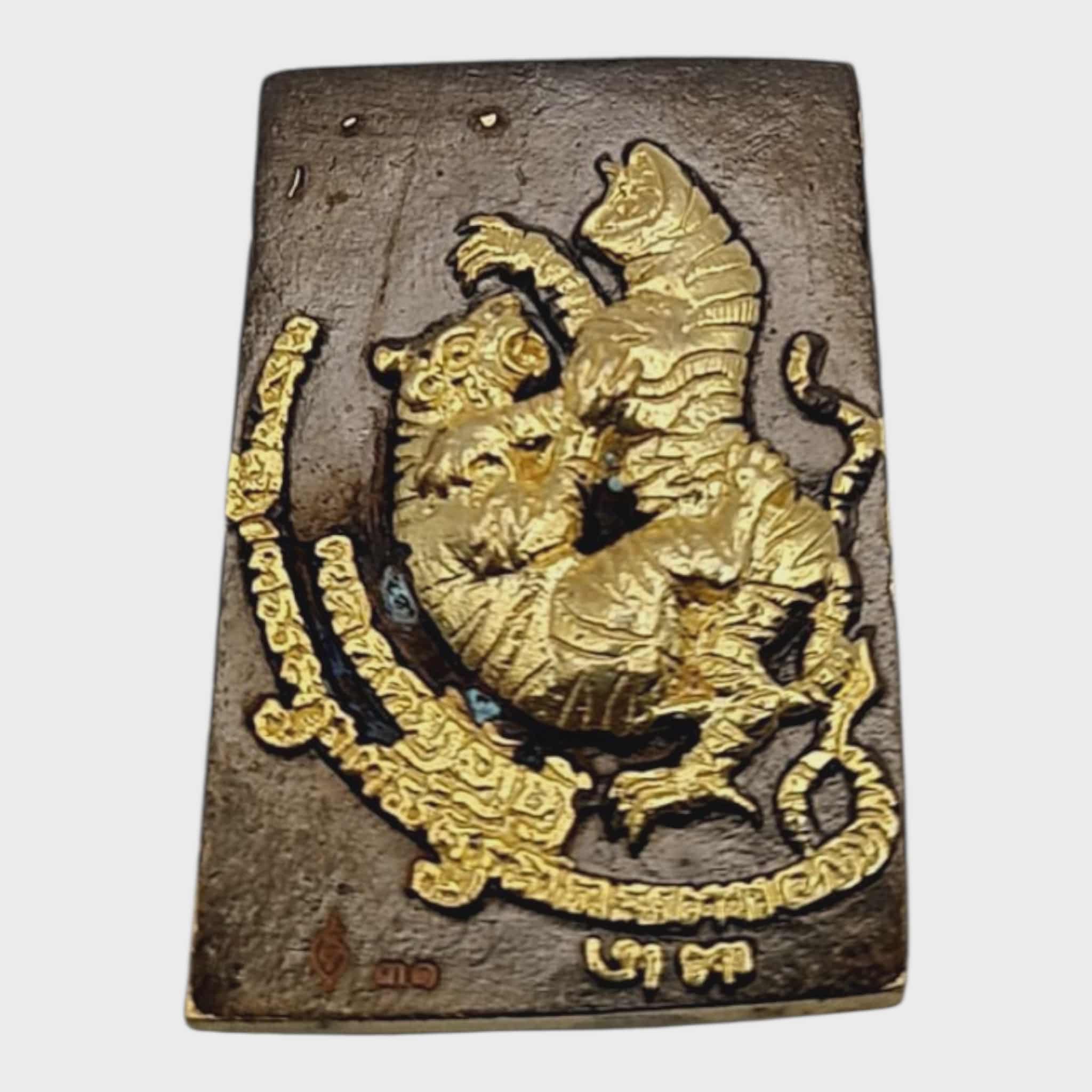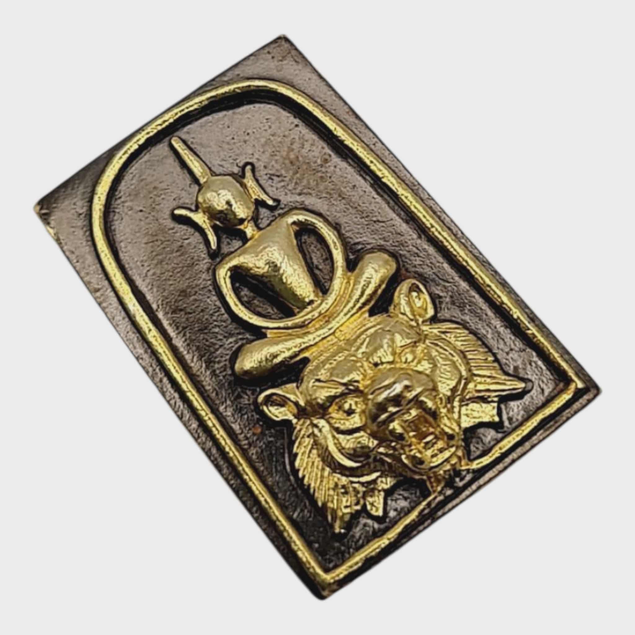 The front features Phra Somdej Buddha image sitting above a ferocious tiger head, representing supreme power and leadership.
